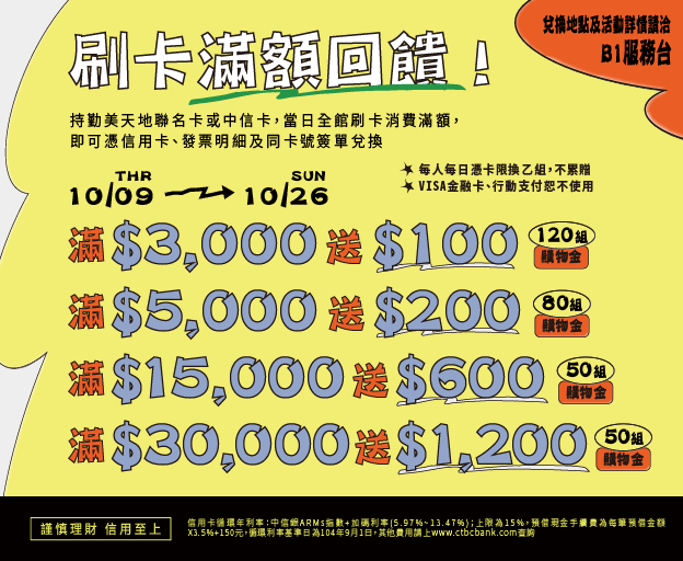1.每人每卡每日限兌換乙次,不可跨門檻累換,正附卡分開計算,簽單金額不得跨日跨店累計贈送,超出金額恕無法累積兌換。