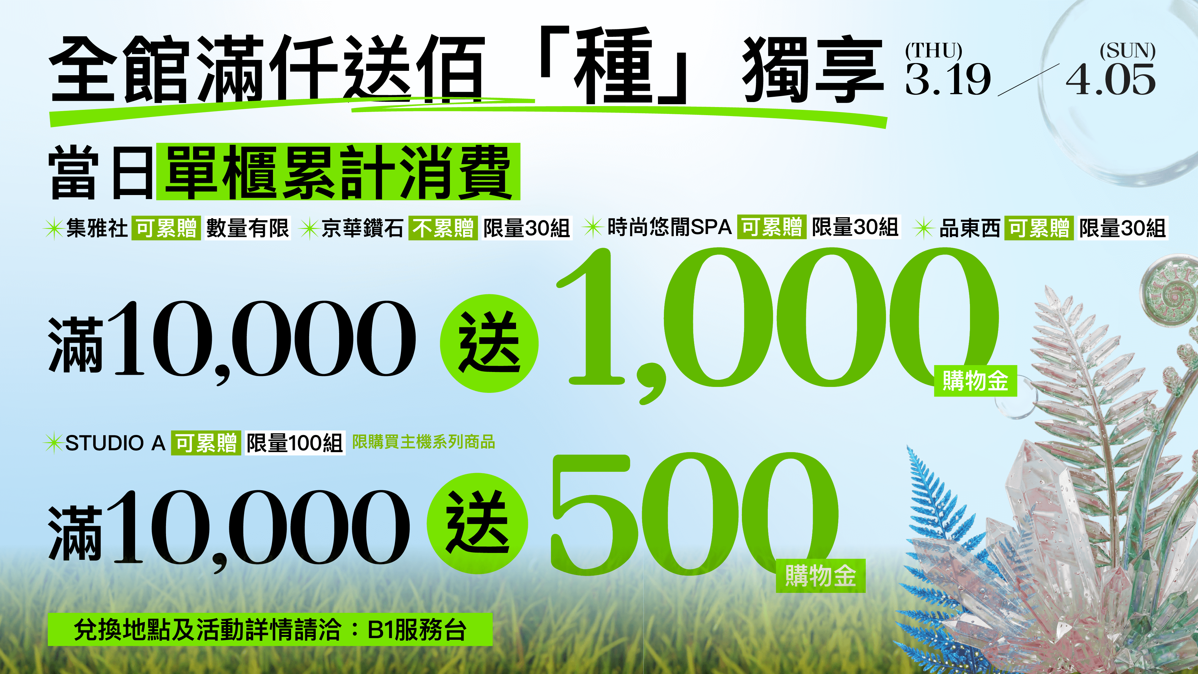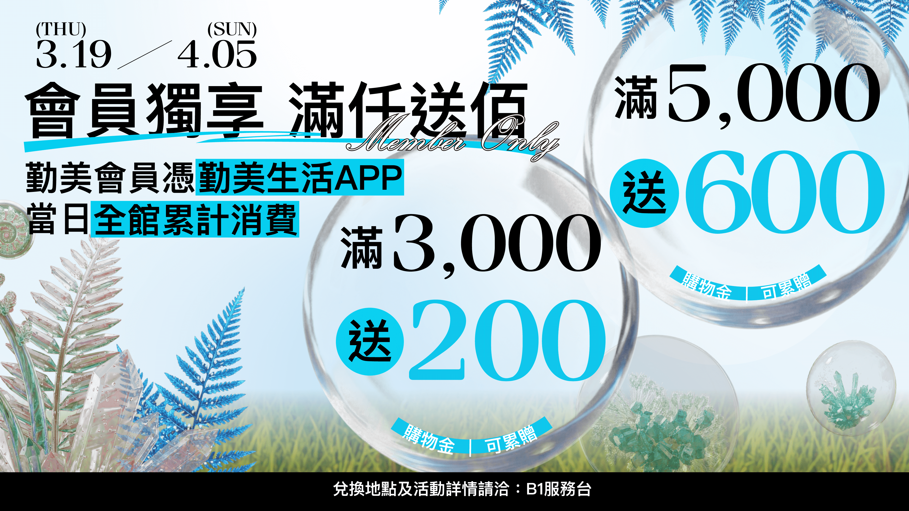 1.活動限當日同一會員帳戶消費累積核算,恕不接受跨日累計,且已兌換之發票金額不得併入下次消費累計。2.贈獎活動兌換金額不包含獎勵金、APP 優惠券、禮券、折價券、會員點數折抵、紅利折抵、提貨單、二/三聯式手開發票、購買/加值儲值卡之金額,且恕不接受代領。3.參加全館滿仟送佰櫃位以B1服務台公告為主,B1 Starbucks Coffee星巴克、POYA寶雅、鴻晴國際、1F全家便利商店、日藥本舖、2F MUJI 無印良品、3F第六市場(金仔米店、8兩津水產、滷室、艸蔬果行、卡哩卡哩亭)則不在此限制之內)、4F USTINI、加賀屋聯合特賣,多利寶寢具、6F SNOWIN滑雪學校及獨立門檻之櫃位,恕不參加此活動。4.購物金儲存於勤美生活APP或勤美會員卡中,並可於下次消費時折抵使用(部分專櫃除外),每次折抵金額以100元為單位,使用期限至2026.05.10止,逾期無效。5.購物金為無償贈品,故不找零或折換現金。6.購買商品如欲退貨,需將贈品完整退回方可辦理,如購物金已使用,需以原價購買,敬請見諒。7.滿仟送佰之購物金請至B1服務台兌換。8.其他未盡事宜依B1服務台公告為主,本商場保有活動說明、解釋、修正、更改、取消之權利。