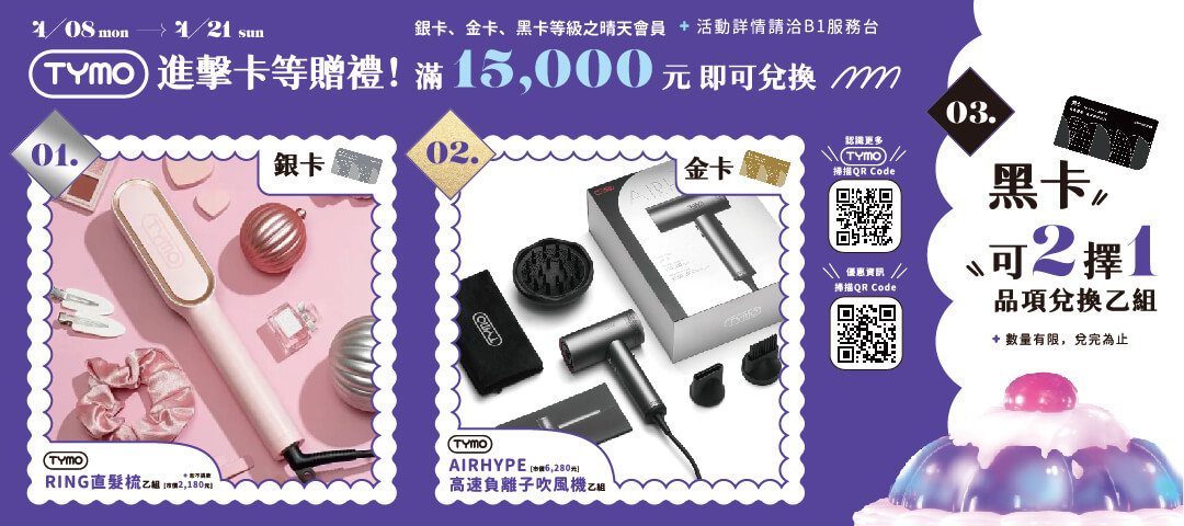 注意事項:1.每人每卡每日限贈乙組,恕不累贈,贈品數量有限,贈完為止。2.恕不接受代領及兌換成現金,亦不得補差價兌換其他商品。3.本活動參加櫃位以B1服務台公告為主,B1 POYA寶雅、Starbucks Coffee星巴克、集雅社、1F 全家便利商店、日藥本舖 、3F 第六市場(「金仔米店、8兩津水產、滷室、艸蔬果行、卡哩卡哩亭」則不在此限制之內)、4F 加賀屋聯合特賣、5F TRUE FITNESS、6F SNOWIN滑雪學校,恕不參加此活動。4.兌換金額以紅利折抵後計算,活動兌換金額不包含購物抵用券、禮券、折價券、會員點數折抵、紅利折抵、二/三聯式手開發票、購買/加值儲值卡之金額,限消費當日兌換。5.簽單金額不得跨店、跨日累計贈送,超出金額恕無法累積兌換。6.圖片僅供參考,本活動兌換之贈品,除瑕疵品外,恕不接受退換,且購買商品如欲退貨,需將贈品歸還,方可辦理,如贈品已拆封或因其他因素無法退回,需以市價購買。7.其他未盡事宜依B1服務台公告為主,本商場保有活動解釋、修改、變更、取消活動之權利。